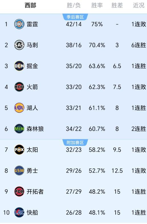 湖人战罢来到33胜21负,西部第五,反超森林狼一步抢回主动。不过从火箭、湖人、森林狼到太阳,胜场数贴得特别紧,区区2场球就可能排名换人,一场不敢松懈。开拓者27胜29负反超快船升至西部第九,西部中段格局更难预测。