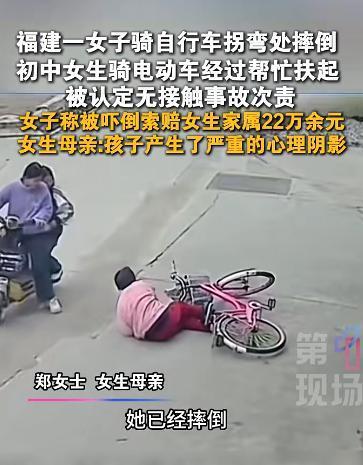 2025年3月,福建莆田一女子骑自行车拐弯时不慎摔倒,两名初中生骑电动车经过看到后好心帮忙扶起,被交警定次责。女子称是被吓摔倒的,找女孩家属索赔22万。该案将于2月26日上午在灵川法庭开庭审理。